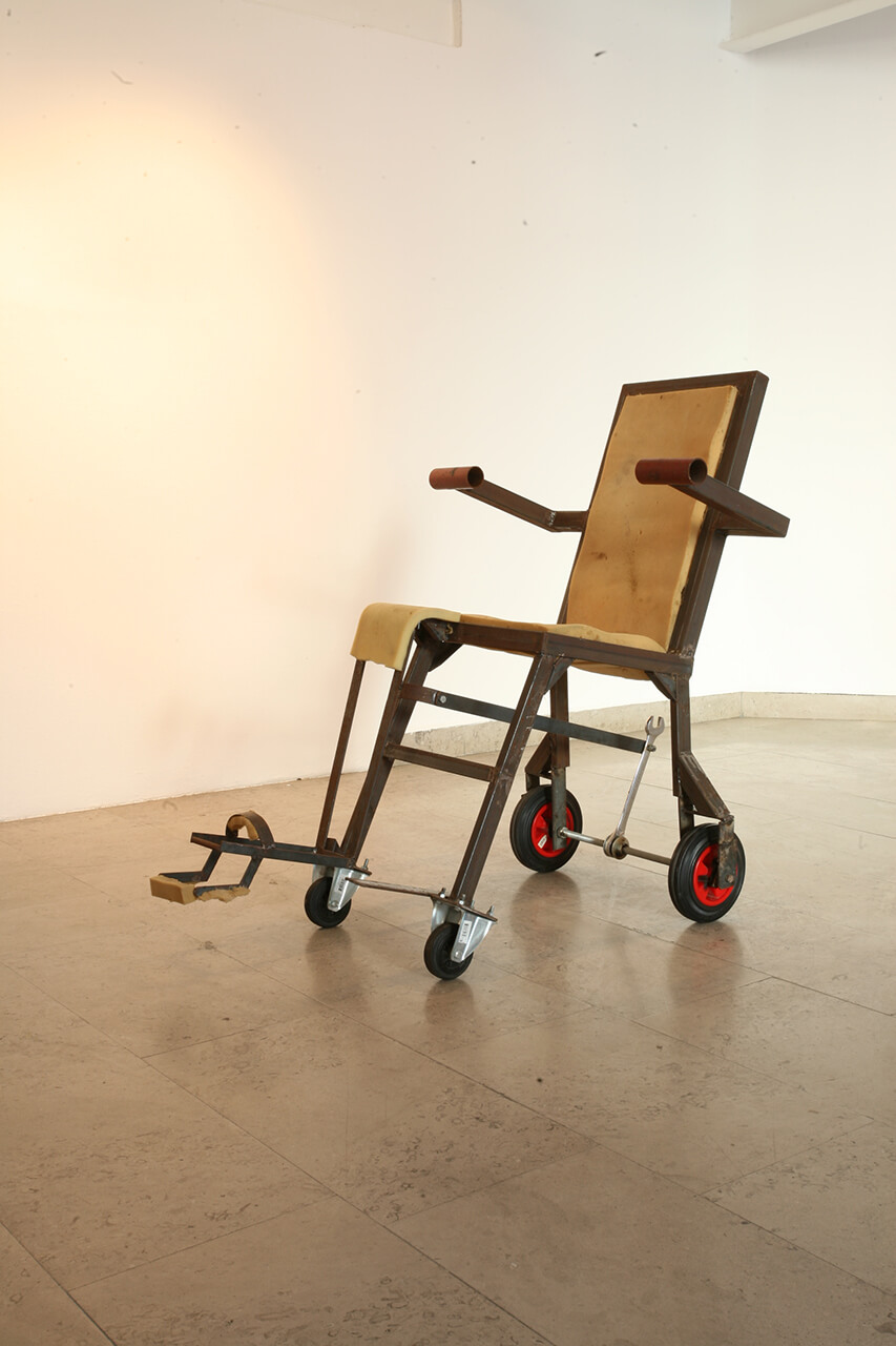 In this exhibition, the artist is showing selected works from his oeuvre, all linked by their presence in the living space of the ordinary working person. At first glance, the viewer sees a chair, a sofa, a toilet bowl, a set of work clothes and tools, and a donkey as a traditional transport animal. The common thread linking all of this is – loosely following Marx – the (re)production of the working person, as it takes us through their everyday life, which includes both work and so-called free time, since the latter, devoted to rest and eating, merely enables continued work. However, a closer look reveals that each exhibited piece is not only what it appears to be, but also possesses an additional, inversely proportional function. The chair, for example, allows the person sitting on it to kick the person standing in front of them and hence move forward. By turning the handles in a rowing-like motion, the user of the sofa sets in motion the circulation of the money hidden in the mechanism behind it. The toilet bowl, equipped with a power socket within arm's reach, ensures that even during elimination – one of the few, if not the only, acts excluded from the production process (a notion indirectly confirmed by the saying that even the emperor goes there on foot) – the user remains present via a chosen electronic device. The worker's outfit features screens embedded in the sleeves of the overalls with work instructions. Similarly, the donkey, this proverbially resilient working animal, proves useless, as the spots on its completely white body make it appear sick or, at best, merely decorative.