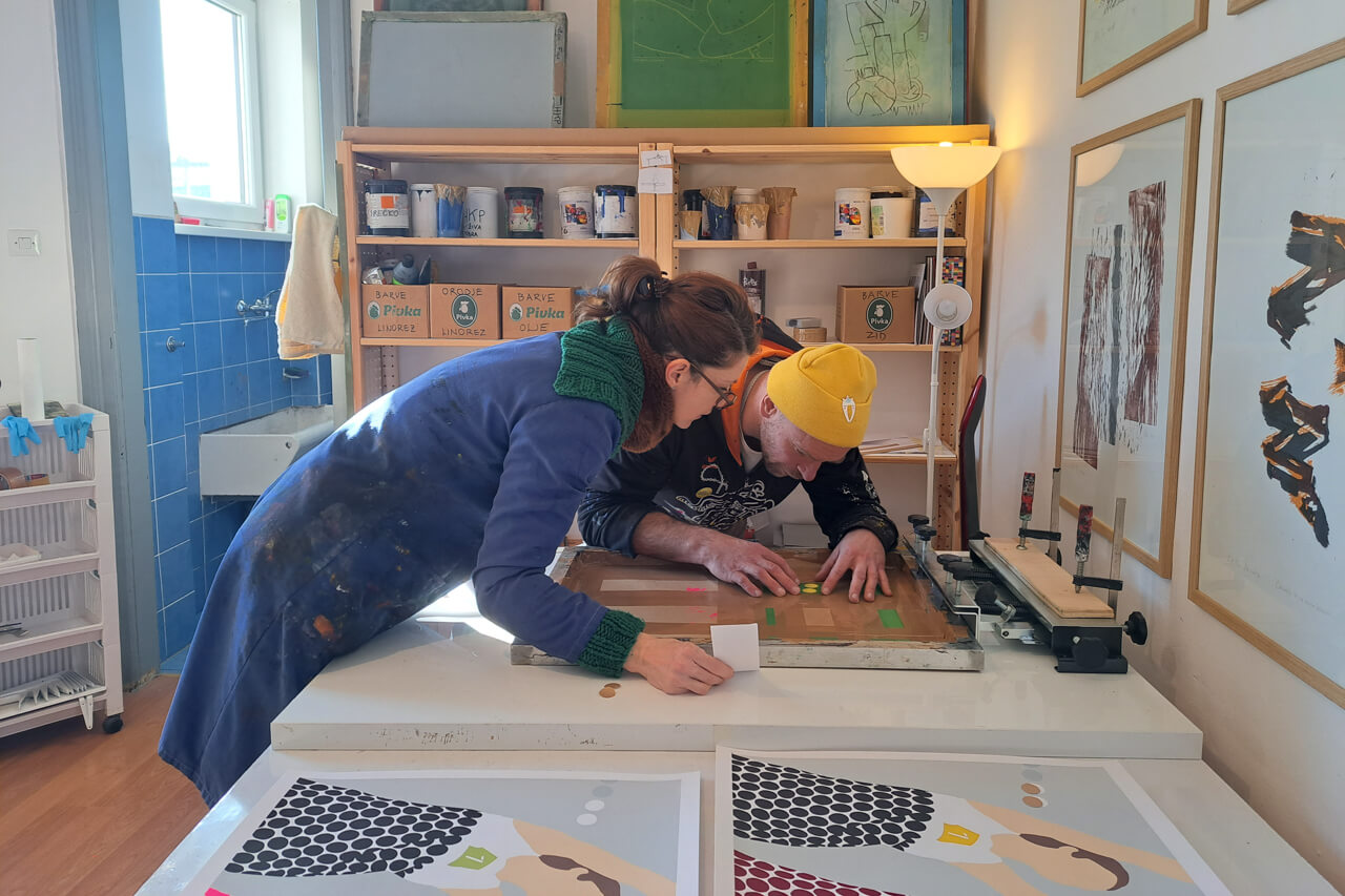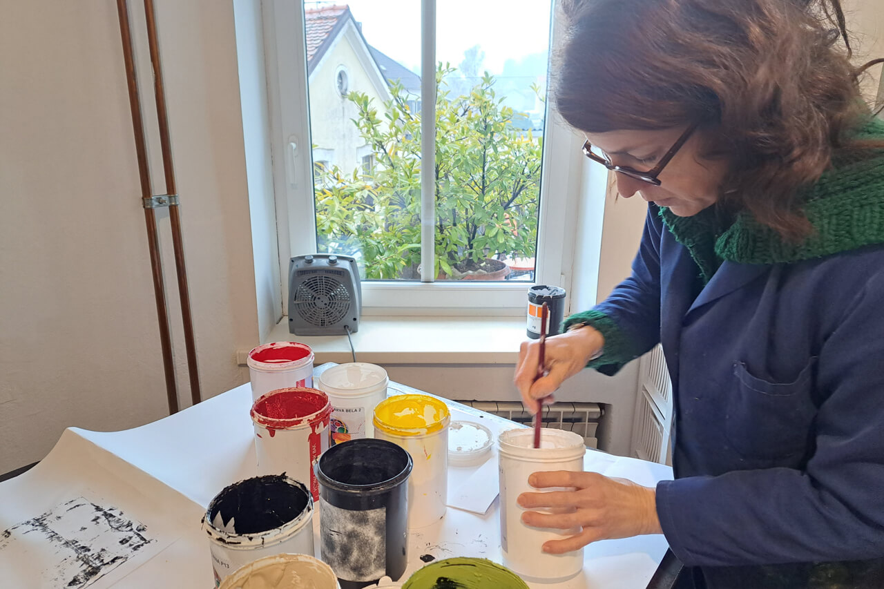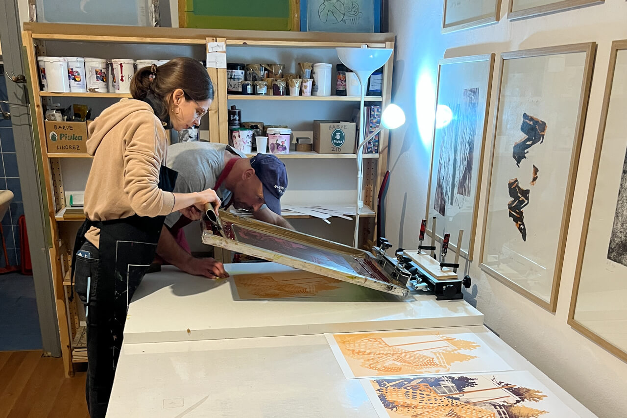 The programme is dedicated to artistic creation in the field of printmaking, mainly in the techniques of screenprinting and relief printing (woodcut, linocut), as well as the production of art publications. The programme takes place in the printmaking studio of Hiša kulture Pivka, which is one of the main strengths and special features of this space. The programme includes the projects ZAPATE – Zine and Print at the Exhibition (2015–), PIVKA 45°40′49.63″N 14°11′46.98″E (2015–2021) and Poems in Prints (2022–2025), the by-product of which become part of the permanent collection of graphic works.